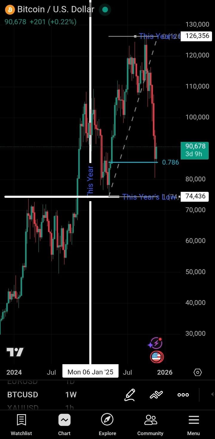 A closer inspection of recent price action indicates that Bitcoin could be reacting to a very strong Fibonacci retracement level. A Fibonacci retracement plotted from this year's low at $74,542 to this year's high at $126,356 leaves us with a 78.6% fib retracement at $85,591. This is, not surprisingly the level where buyers are suddenly reappearing in recent price action.